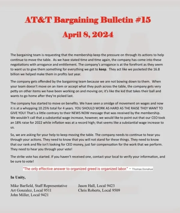 News AT&T Core Bargaining Bulletin #15 08 Apr, 2024 Please Consider Supporting if You Can 03 Nov, 2025 News Please Consider Supporting if You Can Please Consider Supporting if You Can Protect Voting Rights 10 Oct, 2025 News Protect Voting Rights Protect Voting Rights Get in the Fight! 06 Oct, 2025 News Get in the Fight! Get in the Fight!