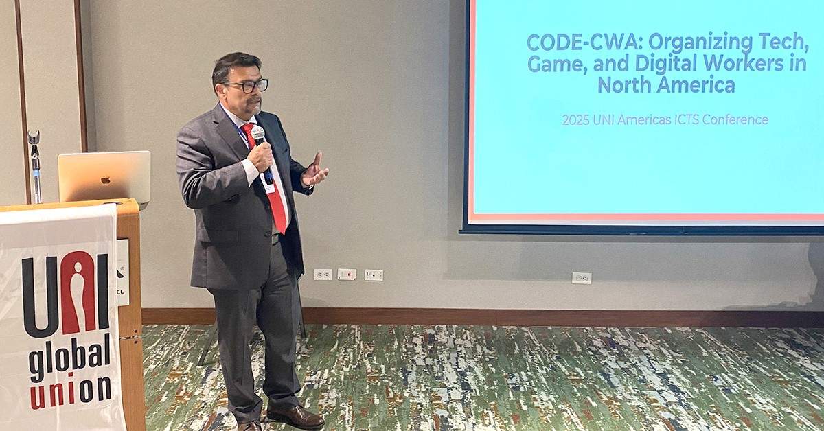 Above: CWA District 9 Vice President Frank Arce gave a presentation on the organizing work happening in the tech, gaming, and digital sector and the UNI Global Conference in Bogotá, Colombia.
